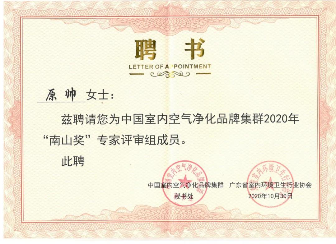 哈爾濱市室內(nèi)環(huán)境凈化行業(yè)協(xié)會(huì)會(huì)長(zhǎng)、黑龍江凌霄環(huán)境監(jiān)測(cè)有限公司總經(jīng)理原帥女士被聘請(qǐng)為中國(guó)室內(nèi)空氣凈化品牌集群2020年“南山獎(jiǎng)”專家評(píng)審組成員。